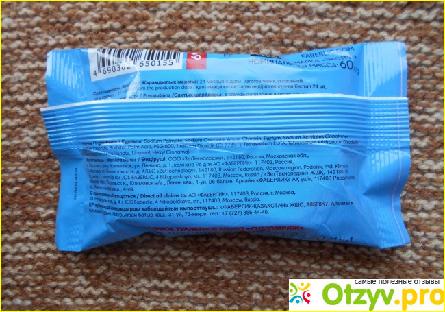 Произведено фигурное мыло ООО «Зет Текнолоджи» (от косметической компании Фаберлик). Вся стандартная информация о средстве гигиены нанесена на упаковку.