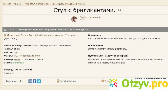 Здесь можно увидеть жанр, размер самого произведения в страницах, какие главные герои принимают участие, какой рейтинг, есть возможность посвятить историю кому-то конкретно, разрешает ли автор копировать рассказ и публиковать на других ресурсах, закончен ли он на данный момент или находится на стадии написания. А еще можно дать награду от благодарных читателей, которым понравилось.