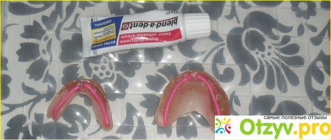 Не настолько она хороша, как ее хвалят. А вернее сказать отвратительная. А вот фиксирующий крем марки Blend-a-dent нам понравился больше. Я говорю "нам", потому что наношу на пластины крем я, мама сама не может. Чищу от остатков крема тоже я. Горло в тюбике крема Blend-a-dent довольно узкое, поэтому крем выдавливать сложно, нужно делать это двумя руками . Но зато его более аккуратно можно нанести, лишний крем потом не вылезет за края протеза когда его прижимаешь к челюсти. Так обычно было с Корегой. Выглядит это так.