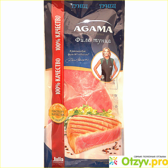 По некоторым данным, мясо тунца снижает уровень холестерина и кровяное давление. Тунец содержит много белка и жира. В продаже представлено большое количество различных готовых продуктов и полуфабрикатов из этой рыбы. Тунец от компании Agama – это замороженное филе тунца, цельное мясо, лишённое кожи. Продаётся в виде порционных стейков.