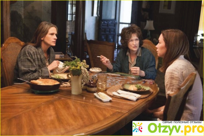 Джулия Робертс, которая тоже здесь сыграла одну из главных ролей является непривычной, не такой какой мы привыкли видеть, достаточно властной, резкой, местами отличающейся значительной грубостью, и не стесняющейся в выражениях. Пожалуй это один из фильмов, где она сыграла реально нестандартно, и ради этого стоит данную картину посмотреть. Каждый участок на застолье довольно хорош и интересен, однако остальные роли значительно уступают двум ведущим, хотя возможно это с одной стороны так задумано может, чтобы передать некий контраст.