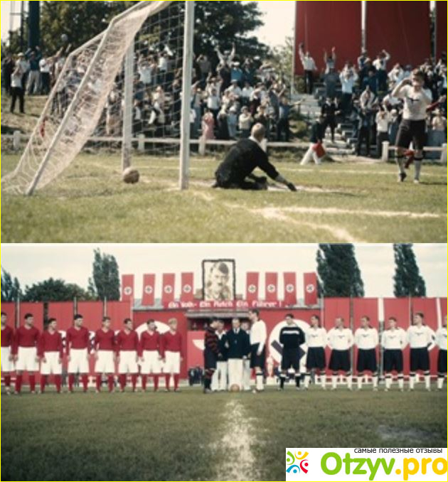Про этот фильм у многих людей возникают строго противоположные впечатления. Кому-то он понравился, а кому-то и нет. Я скорее отношусь к первым, но тем не менее замечаний к данному фильму у меня тоже немало. Прежде всего можно отметить о том, что несмотря на название, фильм всё-таки не о футболе. Здесь вы не увидите спортивную драму, скорее этот фильм о жизни в оккупации, патриотизме, человеческом мужестве и о многом другом. Правда, подано это всё в фильме немножко бездарно и скомкано. Чувствуется, что в первую очередь пытались создать именно патриотичный фильм, что в какой-то мере получилось. Поэтому претензии также имеются. В кино подняты острые темы о 2-й мировой войне. Здесь нам показывают геноцид евреев, который проходил на оккупированных территориях. Это показано жёстко без всякой лирики. Спасение главными героями еврейского парнишке и девочки конечно же выдумка, но которая хорошо укладывается в тему фильма.