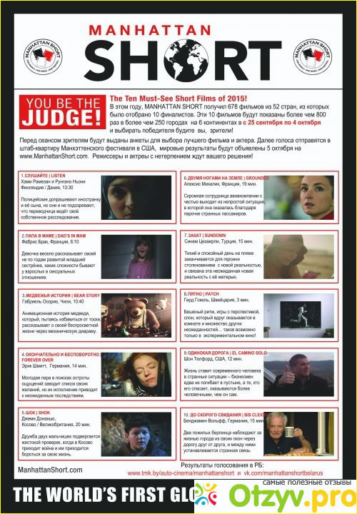 Как уже побывавший зритель на Манхэттенском фестивале короткометражного кино, хочу вам сказать, что общая идея, сборы зрителей, желающих выбрать свой фильм, бурные обсуждения виденного, увлекательные споры о понравившемсе фильме, рассказы тем, кто не смог попасть на данное зрелище, по истинне обьеденяют людей, вносят в нашу жизнь маленький праздник, и заставляют нас с нетерпением ждать следующего и безумно увлекательных новых сюжетов, который так старательно готовят режиссеры и сценаристы для своей победы.