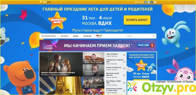 Когда я первый раз забрела на сайт Фильмпро ру, я думала, что там можно скачивать или смотреть фильмы онлайн. Но оказалась, что там можно посмотреть только трейлер фильма. Трейлер фильмов на сайте в очень высоком качестве. Так же на сайте можно найти много информации о фильмах, новости о кино, актерах, репортажи, статьи, интервью звезд, можно посмотреть Афишу кинотеатров во многих городах. На сайте в разделе топ ожидаемых фильмов в рубрике что посмотреть можно увидеть новинки кино, которые появятся в кинотеатрах в ближайшее будущее. Там же можно увидеть рейтинги фильмов и узнать топы кино. В разделе график премьер можно сделать выборку ожидаемых фильмов по годам. В разделе ТВ программа можно посмотреть программу теле передач с кратким описанием программ.