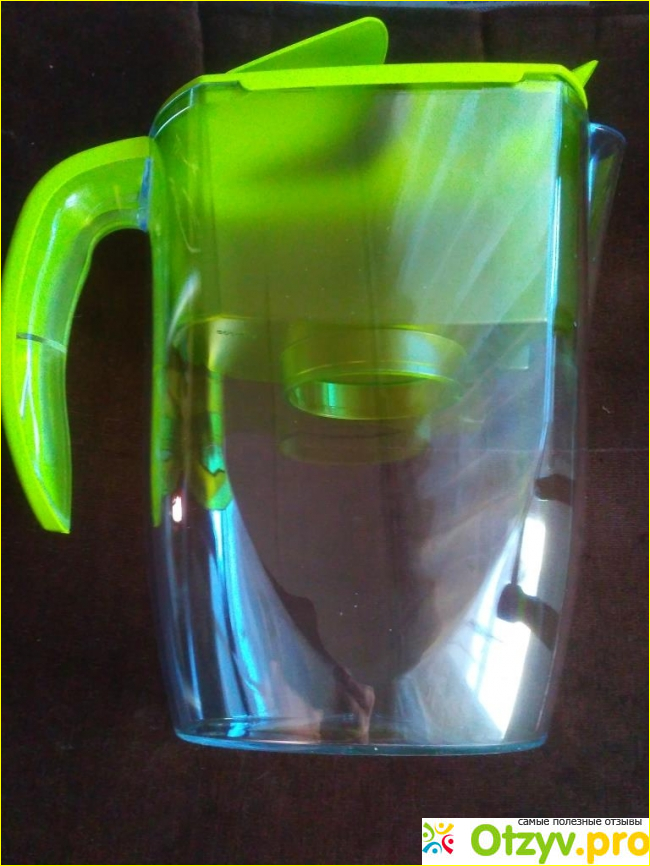 Сам кувшин из прозрачного пластика. Довольно узкий и его удобно поставить в любое место, так как не занимает много площади.