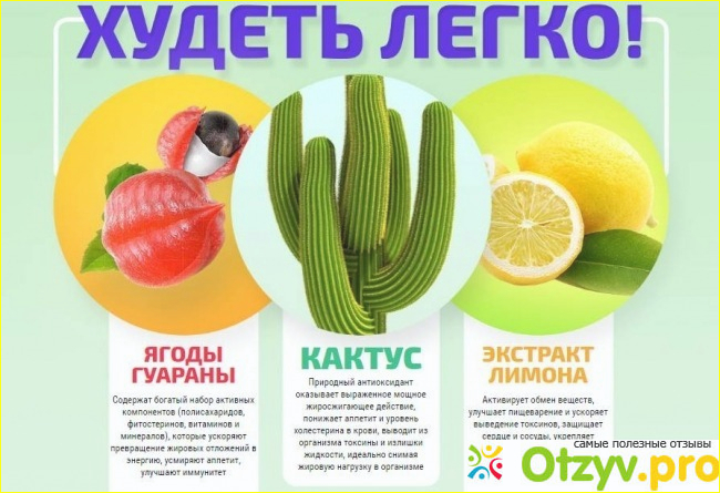 Экстракт кактуса по силе своей полезности сочетает действие гуараны и лимона: сжигает лишние жиры, выводит шлаки и токсины из организма.