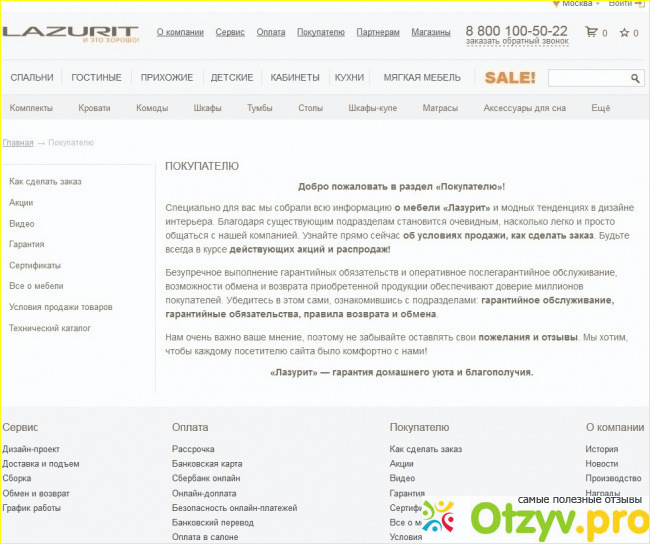 Перед оформлением заказа нужно, само собой, уделить внимание разделу "Оплата" и выбрать самый удобный и безопасный для себя способ. Оплатить заказ можно не только наличными непосредственно в магазине фирмы "Лазурит", но и при помощи банковской карты, через сервис "Сбербанк онлайн" или же отправить оплату банковским переводом.