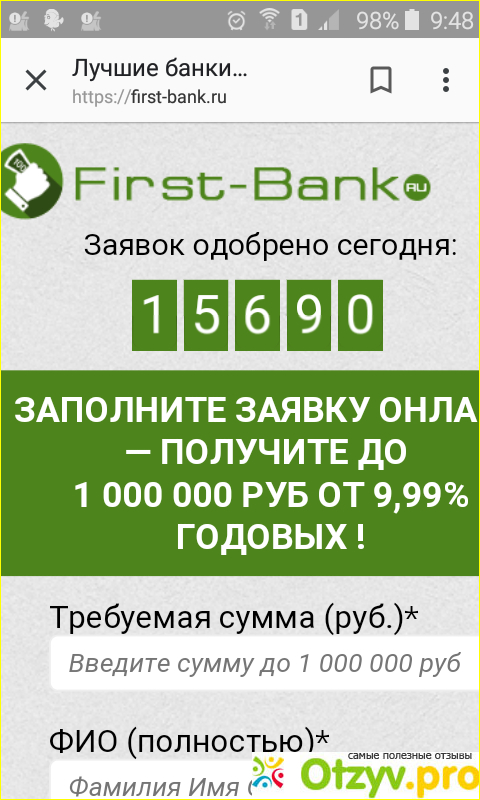 Многие люди, интересующиеся информацией о возможности взятия кредита в сети Интернет, сталкиваются с ссылкой на сайт first-bank.ru. Возникает естественный вопрос: "Что же это за сайт такой?" По названию сайта можно подумать, что это сайт какого-нибудь банка. Но это не так...
