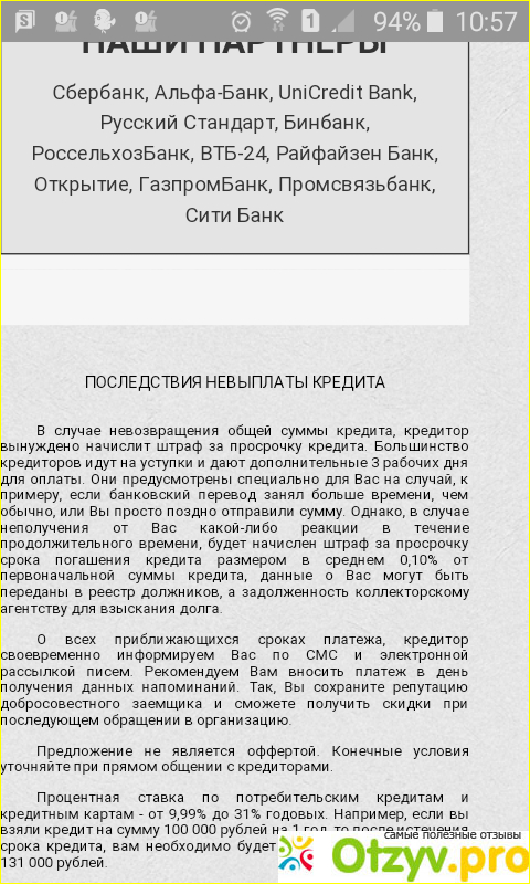 Обратите внимание, что на сайте отображаются последствия невыплаты кредита. В общем, хорошо, если Вы платите вовремя, а ещё лучше, если у Вас получается заплатить заранее, хотя бы на три дня раньше указанного в договоре срока, так как у некоторых банков платежи проходят не моментально, а в течении нескольких дней. А за эти несколько дней Вам начислят и штрафы, и пени, и много всякой... ненужной заботы) Но это не касается данного сайта, это уже касается работы некоторых банков (был негативный опыт в одном из банков из списка партнеров сайта, поэтому знаю не по наслышке).