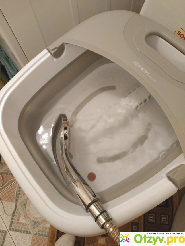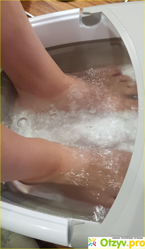 Ванночка прочная, из хорошего пластика и силиконовых вставок. Подойдет для больших и маленьких ног. На что я обратила внимание - это то, что кнопка переключения режимов располагается у самых ног, и в процессе использования не совсем удобно ею пользоваться, хотя со временем можно быстро к этому привыкнуть. Для одной процедуры потребуется около четырех литров воды. Нагрев работает отлично. Пузырьковый режим для меня один из самых любимых. Он расслабляет, особенно это хорошо для уставших после длинного рабочего дня ножек. Пузырьки немного бьют по стопе, это решается, если немного приподнять ноги.