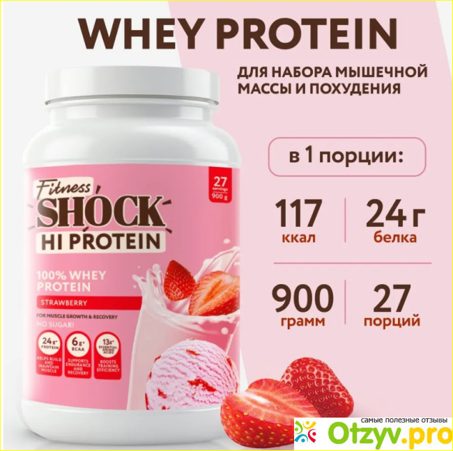 Начала я поиски своего первого протеина и остановилась на Fitness Shock. Этот протеин сывороточный, не содержит сахара, а еще у него вкус клубники. Объем банки - 900 гр. Банка, кстати, выглядит очень мило, это я уже говорю со стороны девочки)). Итак основные показатели: в одной порции данного протеина находится целых 24 гр белка. Я смешиваю с молоком, по вкусу получается обычный молочный коктейль с клубникой, только не приторный. Можно смешивать также с водой, он так даже лучше растворяется, точнее быстрее. В молоке растворяется хорошо, не оставляет комочков. Пьется тоже легко, после него есть чувство насыщения. Мой первый протеин меня порадовал, каждый день выпиваю 350 мл и закрываю половину своей нормы по белку. Однозначно рекомендую к покупке!
