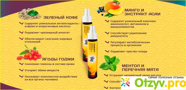 В спрее содержится лимонная кислота. Это вещество притупляет чувство голода, а так же оно принимает активное участие в процессе пищеварения. На этом список всех активных компонентов не заканчивается.