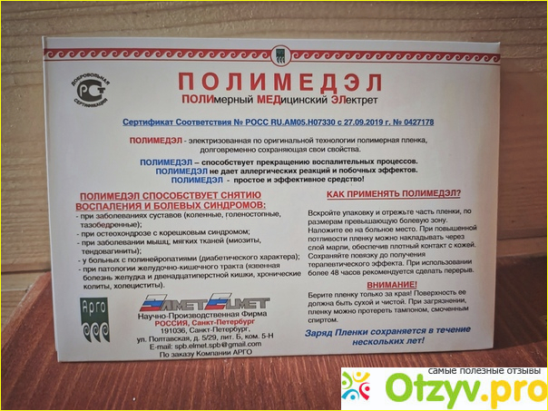 Официальным дилером компании производителя Полимедэл является Российское потребительское общество АРГО. На всех упаковках с пленкой можно увидеть его маркировку. Есть и сертификаты соответствия, регистрационные лицензии и удостоверения, и разумеется, за три копейки его тоже никто продавать не будет. И вообще, нужно помнить, что Пленка Полимедэл это не таблетка и не гарантирует вам 10% излечение от всех ваших болезней.