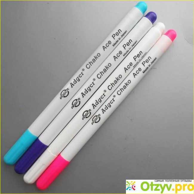 С недавних пор я стала пользоваться разноцветными фломастерами фирмы Adgcr, которые смываются обычной водой. Хоть я и заказала их на Али Экспресс, но изготовлены эти чудо-фломастеры в Японии. В наборе было 4 фломастера - голубой, фиолетовый, розовый и белый. Последний меня особенно порадовал, так как его прекрасно видно на темных тканях. В том же интернет-магазине можно найти наборы смываемых фломастеров и в другом цветовом сочетании, но меня пока устраивают эти цвета. Они позволяют делать хорошо заметные линии на тканях самой различной фактуры и расцветки.