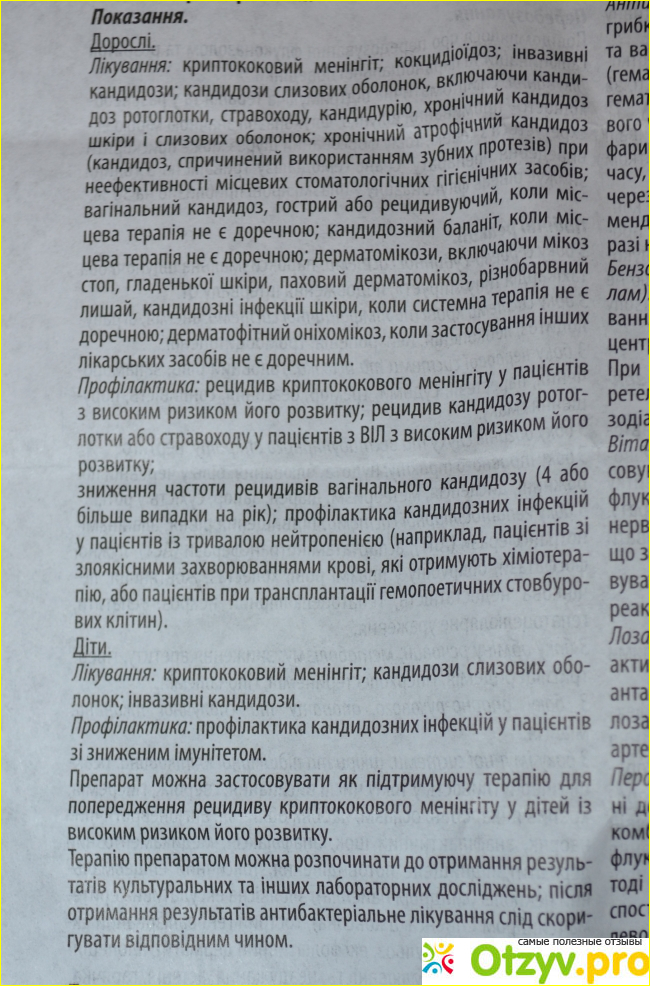 Прежде всего это криптококкоз, которые поражает легкие, кожу, а также те виды криптококкоза, которые вызывают воспаление мозговых оболочек, то есть так называемый криптококкозный менингит. Вторая область применения данного препарата - это генитальный кандидоз, в том числе и кандидоз, который поражает стенки влагалища. Также его назначают при воспалительных заболеваниях головки полового члена, в частности при баланите, чтобы предотвратить рецидивирование инфекционного процесса. Эффективно применение препарата при кандидозном поражение слизистых оболочек рта, в частности когда человек носит зубные протезы, а также когда грибковая инфекция вызвала поражение пищевода, глотки, а также когда процесс пошел в дыхательные пути.