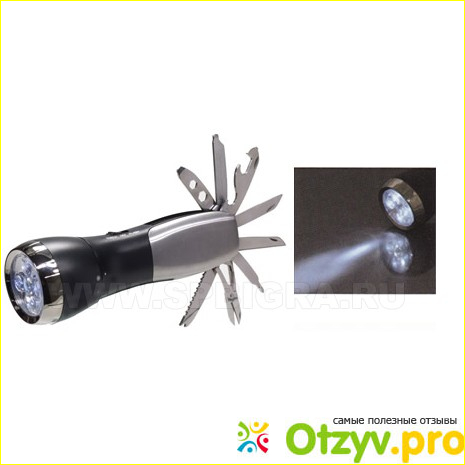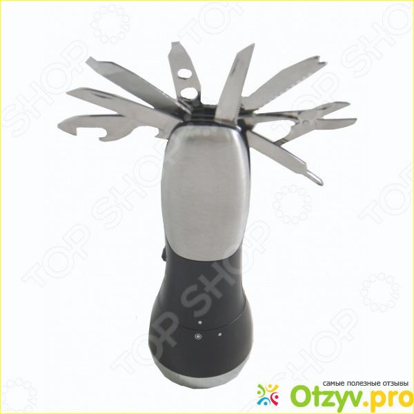 Но основная его фишка заключается не в этот. Ведь не зря же он получил такое название как многофункциональный. Если посмотреть на обратную сторону фонарика и разложить его, то он легким движением превращается в многофункциональный прибор. Так как из этого фонарика можно вытащить очень много различных инструментов, которые вам могут пригодится в любой момент.