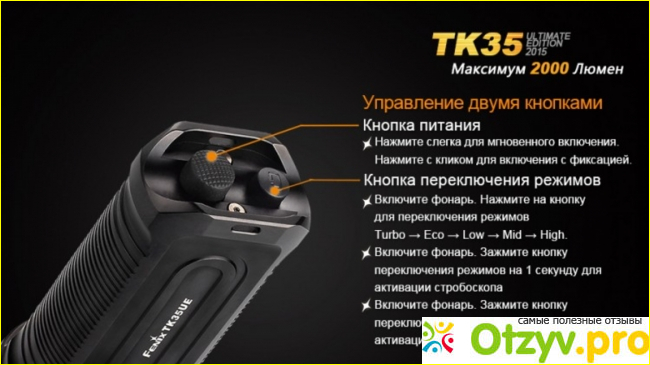 1. Турбо (самый яркий- 2000 люменов, время работы составляет 1 час 15 минут).