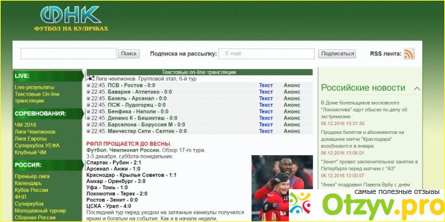 Тут тебе и результаты в живую из лиги чемпионов различных групп. И ты всегда посмотришь LIVE-РЕЗУЛЬТАТ на данное же время, и тестовые трансляции с мнением. Полная подборка материалов по чемпионату мира 2018 года с полной таблицей матчей. Вся нужная и интересная информация лиге чемпионов, лиге Европы, Суперкубке УЕФА, о клубных чемпионатах разных стран. Особенно меня например интересует Российская премьер-лига, кто с кем и когда играет, турнирные таблицы описания в подробностях всех турниров с мнением комментаторов. Молодёжные турниры. Суперкубки . Огромная подборка сайтов всех известных команд России тут тебе и ОФИЦИАЛЬНЫЕ САЙТЫ КОМАНД ПРЕМЬЕР-ЛИГИ от Амкар (Перми) до ЦСКА (Москвы) и ОФИЦИАЛЬНЫЕ САЙТЫ КОМАНД ФНЛ и ОФИЦИАЛЬНЫЕ САЙТЫ ДРУГИХ РОССИЙСКИХ КОМАНД и РЕСУРСЫ О ФУТБОЛЕ. где собранны так же многие популярные футбольные обозрения. Имеется раздел где расписаны и описаны чемпионаты таких стран как Англии, Германии, Испании, Италии, Франции, Голландии, Португалии, Турции, Украины, Беларусии и Казахстана. Так же есть разделы где отображаются трансферные матчи РОССИЯ - ЗИМА 2016/2017 и контрольные матчи. Так же полные хроники по Олимпийскому футбольному турниру 2016 и Чемпионату Европы 2016 года. имеются архивы по Кубку Америки 2016, Кубку Африки 2016, Кубку Азии 2016, Кубку Конфедерации и многое другое.
