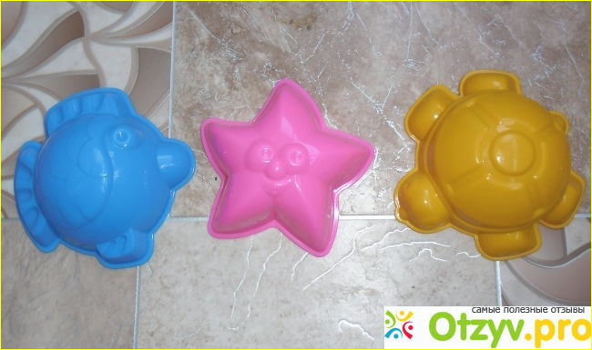 Как я говорила, в наборе три формочки. Полностью оправдывают свое название - "Морские", так как они сделаны в виде рыбки, черпашки и морской звезды. У нас вот такая цветовая гамма, бывают расцветки вообще разные, кому уж какая попадется.