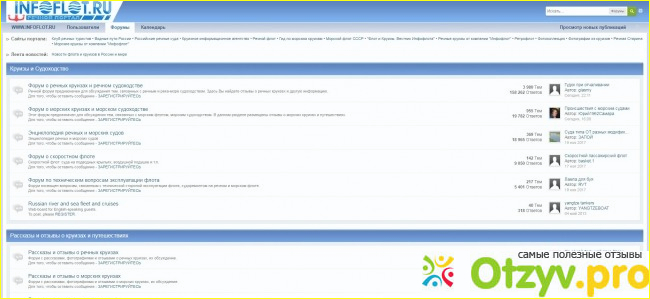 Нашла в сети форум, посвященный речным путешествиям – Он прикреплен к сайту Инфофлота. Очень удобно. На сайте infoflot.ru публикуются новости, а на форуме можно прочесть подробности и особенности организации круизов, те же новости. Можно зарегистрироваться на нем и получить ощутимые преимущества. Тем более, если планируете свои поездки, отдых и круизы по воде.