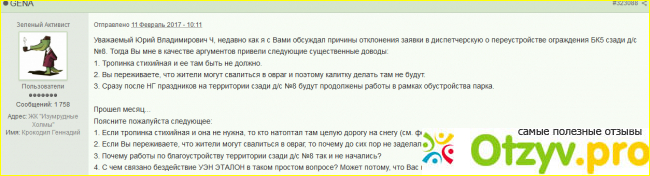 На страницах ресурса есть обращение в ООО "УК Эталон" с приложением фото и видеоматериалов касающихся общих недоработок, и индивидуальных вопросов жильцов подъездов, с конкретным перечнем строительных недоделок, и моментов требующих внимания УК, и городского округа г. Красногорска.