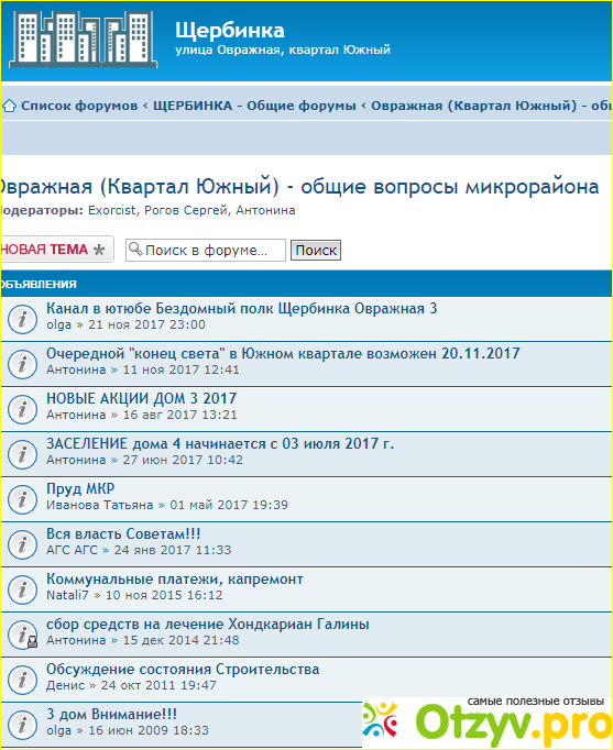 Такой форум создан и у района Щербинка, квартал Южный , улица Овражная, г. Москва.