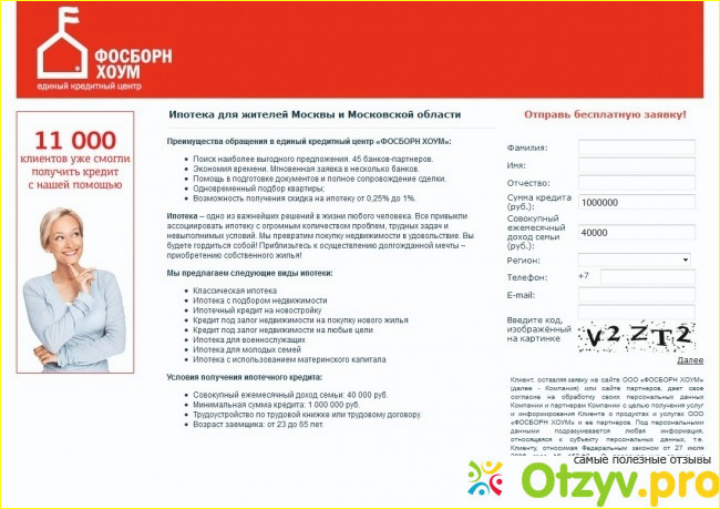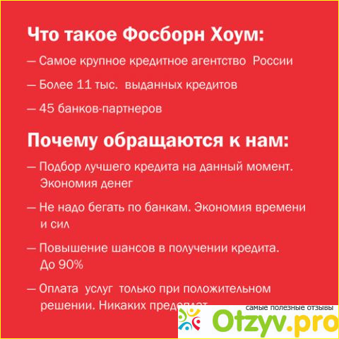 Фосборн Хоум-самое крупное на територии Российской Федерации кредитное агентство, имеющее более сорока пяти банков-партнеров, что значительно увеличивает Ваши шансы получить кредит.