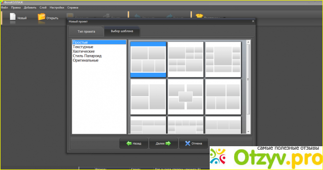 После того, как вы решаетесь создать проект, ФотоКОЛЛАЖ предлагает типы проектов. На вкладке можно выбрать шаблоны. На выбор масса типовых проектов для тех, кто не хочет включать фантазию. Я из их числа.