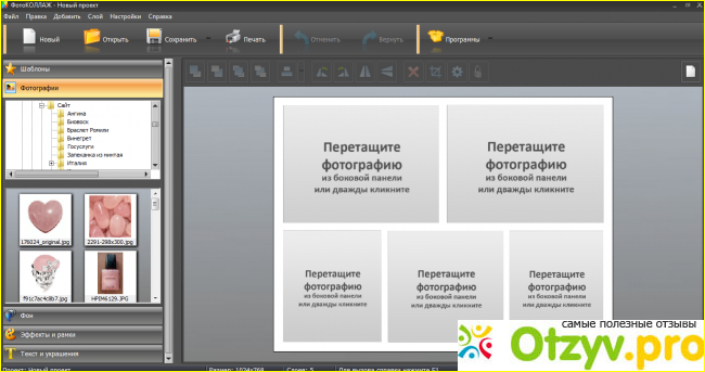 А это болванка нашего проекта. Остается только в левом поле выбрать папку с нужными фото и работать. Картинки можно перемещать, удалять, менять размер, положение, обрезать, переворачивать и т. д. Можно менять фон, добавлять эффекты, рамки, текст, фигурки.