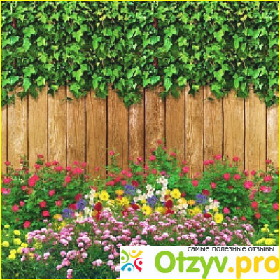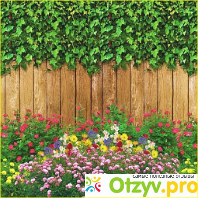 Рисунок изображает забор, украшенный цветами и сочно-зелеными листьями. Этакая дачная тематика, радующая глаз.
