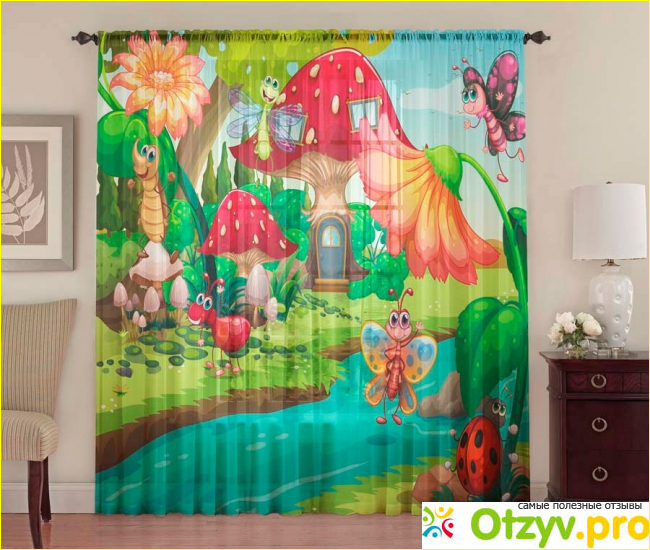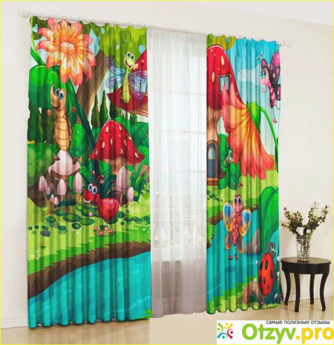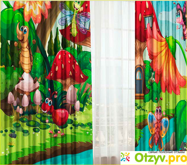 Отличают фотошторы от других аналогичных изделий очень яркий принт в виде мультяшных героев. Украшают портьеры яркие, большие цветы, грибы, жучки, червячки и бабочки.