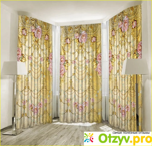 В случае, когда комнате хочется добавить необычности форм и площадь это позволяет — можно повесить гардины трапецией и расположить на них три шторы. Такое интерьерное решение показано как раз на фотографии этого набора в интернет-магазине. Производитель посчитал, что шторы Феличита будут отлично смотреться именно при таком способе развешивания, и потому комплект включает в себя именно три полотна.