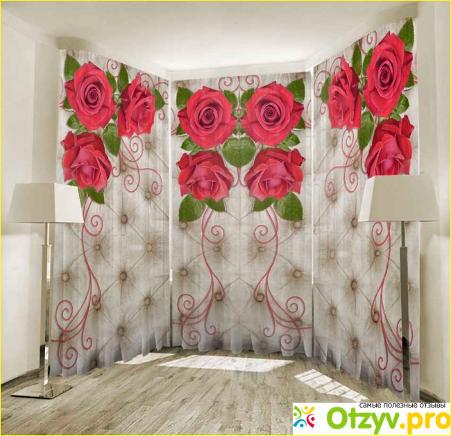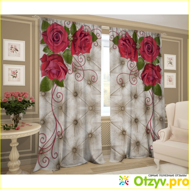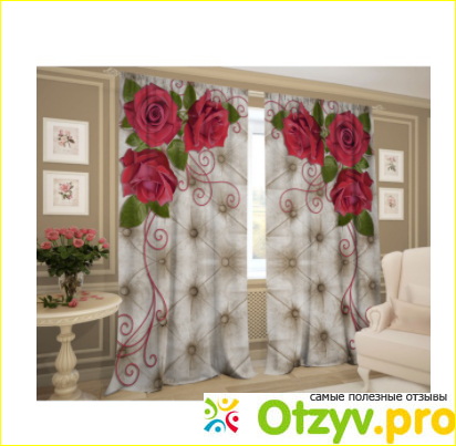 Бежевый фон изделия так интересно сочетается с насыщенным бордовым цветом роз, что отвести глаз от такого сочетания поначалу даже не получается. Помню, как первое время в все время осматривала эти шторы — то как захожу в комнату, с непривычки они бросались мне в глаза, то просто, когда нахожусь от них неподалеку.