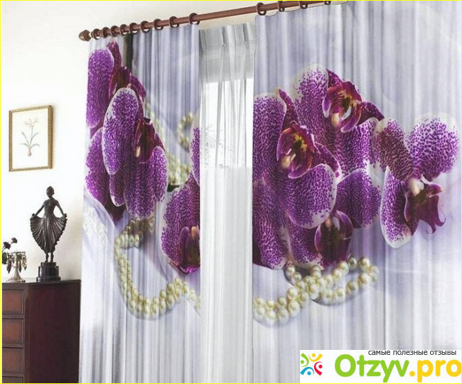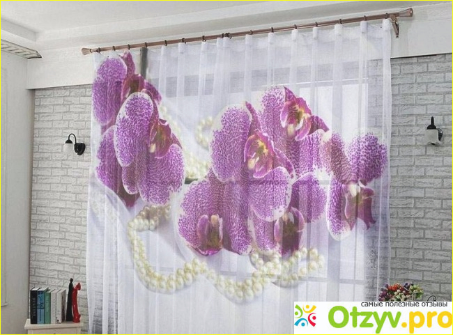 При этом можно отметить, что сочетания цветов подобраны просто замечательно - яркий фиолетовый цвет принта подчеркивает белоснежную нежность основы. На изображении, нанесенном на шторы с помощью метода фотопечати, можно видеть рисунок прекрасных орхидей. Таким образом, фотошторы " Шик" одинаково хороши как для гармоничного оформления интерьера спальни, так и для декорирования окон в гостиной.