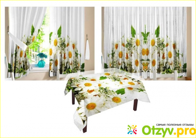 Сами ромашки также имеют преимущественно белый цвет, только их сердцевинки — самые серединки букетиков выполнены в яично-желтом цвете. Приятном для глаз, нежным и, что самое милое, аппетитным: думаю, если повесить такие шторы на кухне, желание кушать будет рождается часто.
