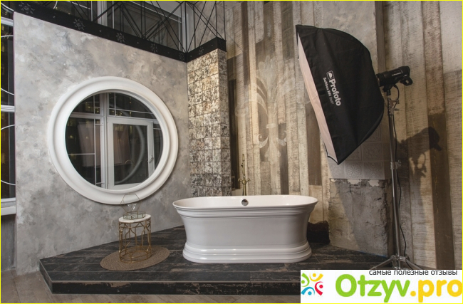 Залы № 2, № 3 с большими окнами в стиле лофт, на фото декорации в зале на Новый год. В Зале №5 большая красивая ванная и душ со стеклянными стенами, выглядит очень стильно. На главном фото часть декораций - интерьерная стена и ванна в окружении большого стильного круглого окна.
