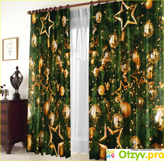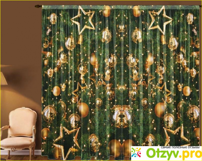 Мы видим насыщенно-зеленый хвойный фон, словно лапки елки заняли все свободное место на ткани занавески. Яркие золотые шары и звезды украшают еловые лапы, контрастно играя на тепло-зеленом фоне.