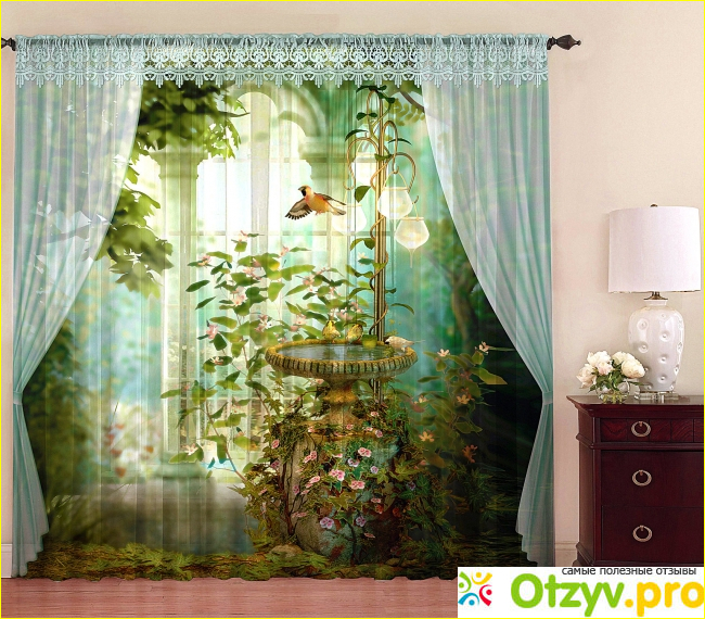 Тюль представляет собой целую смысловую композицию — по окам словно легкие занавесочки. задрапированные подхватами. И они открывают взор смотрящего на мини-фонтан и фонарь, с которого только что слетела певчая птичка.