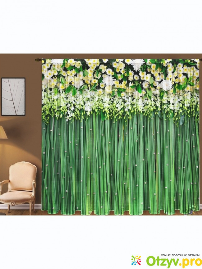 Первым делом мне понравился цвет фототюли - он такой зеленый, яркий, вверху нанесена фотопечать в виде летних цветов: белых с желтыми серединками (как не крути - летний вариант), в то же время с фототюлью можно не использовать ночные шторы, которые я очень не люблю и давно отказалась от них.