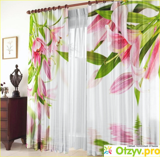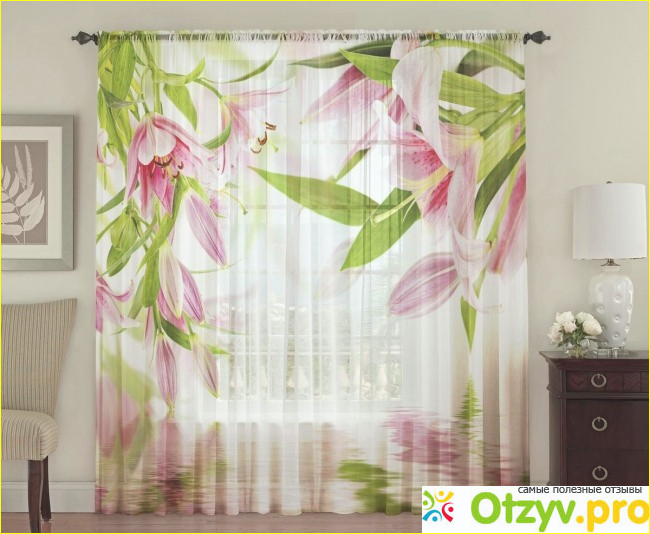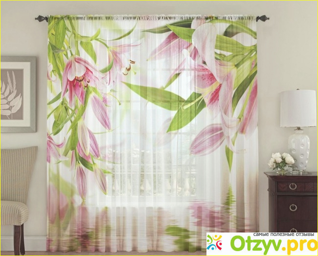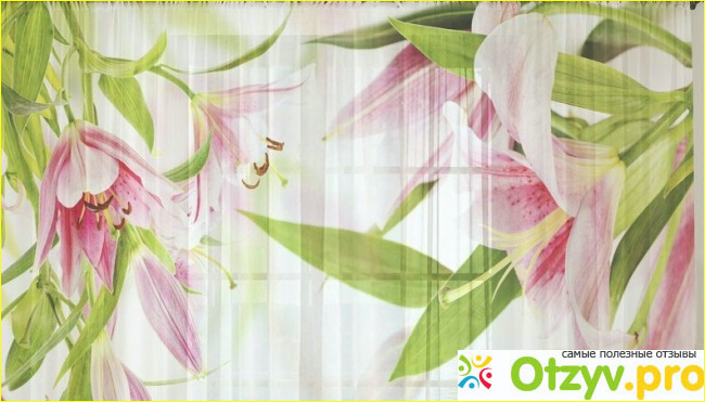 Фототюль "Лилейник", о которой мы говорим, выдержана в светло-розовых тонах с красивыми включениями сочно-зеленого цвета - это листики цветков лилий, который красиво оттеняют общий светлый тон фототюли.