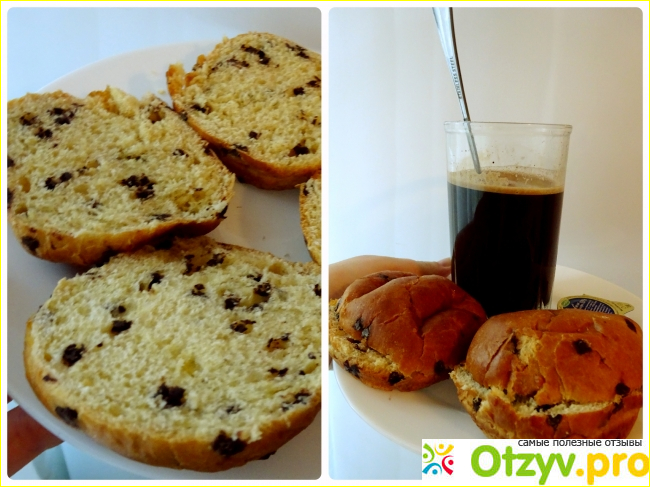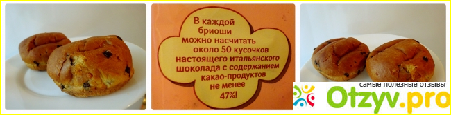Так же на упаковке имелась надпись о том, что в каждой булочке находится 50 кусочков настоящего итальянского шоколада с содержанием какао – продуктов не менее 47%. Сама выпечка имела очень аппетитный аромат и поджаристый, чуть приплюснутый вид. Форма круглая, размер средний (45 гр). На вкус булка очень нежная, в меру сладкая, чем – то напоминающая пасхальный кулич. Внутри выпечка имеет чуть желтоватый оттенок. Шоколадных кусочков очень много, удивительно, что во время выпекания они не расплавились. Он идеально дополняя вкус самой выпечки.