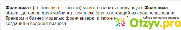 Если перевести это на гражданский, человеческий язык, то это понимается так. У вас есть дикое желание зарабатывать. Но нет на это особых денег, да и идеями вы не блещете. А есть некое предприятие, это могут быть услуги, розничная торговля, другое, которое может вам предоставить возможность заняться своим делом. Они предоставляют вам товар, оборудование, обучают ваших сотрудников, проводят юридическое сопровождение и многое другое. Вы же должны найти помещение для бизнеса и этих самых сотрудников.