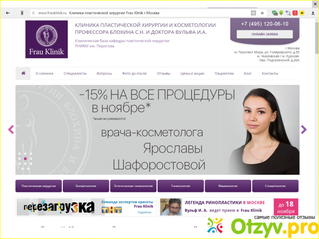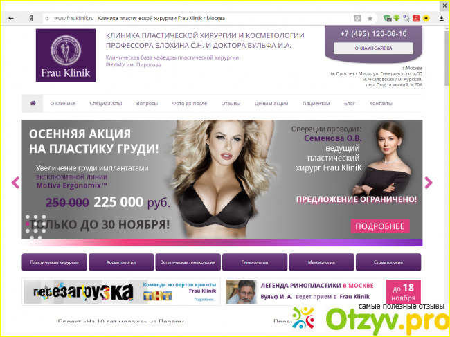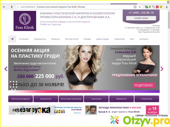 Frau Klinik мне нравится тем, что здесь по всей России не такие дорогие расценки, так же иногда бывает еще и скидка, это в том случае, если вы являетесь ее постоянным клиентом, так же на самом сайте есть более подробная информация, по поводу того что необходимо знать касательно того, какие необходимы подготовки, кроме того такая клиника так же создана ведущими пластическими хирургами международного уровня, то есть это именно организация высокого профиля, она была создана одними из первых пластических хирургов СССР - профессором Блохиным Сергеем Николаевичем, так же все работники здесь высокого профиля, то есть у них богатый опыт, у меня здесь знакомая поправляла форму носа и бюста, осталась довольна, порекомендовала мне, поэтому я доверилась, так же она была основана и доктором Вульфом Игорем Александровичем.