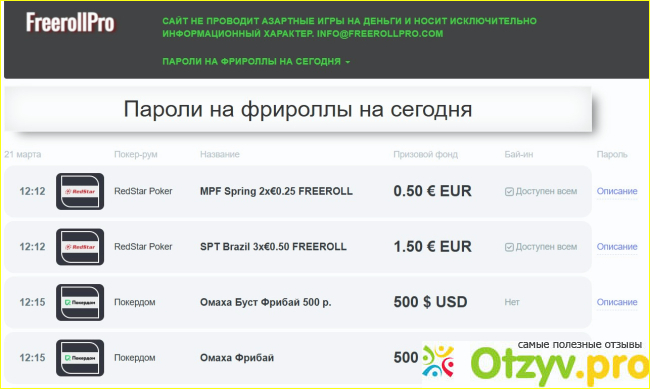 Играю в покер уже не первый год, и фрироллы это мой любимый способ попасть на различные покерные турниры, без вложений. Не так давно узнал о сайте, где собраны только бесплатные фрироллы - без рекламы и прочего мусора. Все четко: список, дата, время, пароль, рум - сел, зарегистрировался и пошел катать.