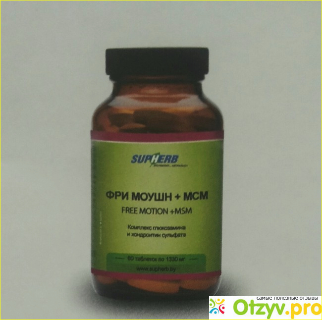 Тогда мне посоветовали принимать Фри Моушн+МСМ. Это БАД, производитель которого - израильская компания SupHerb. Препарат упакован в стеклянную банку темного цвета, таблетки белые, без вкуса и запаха, но довольно большие (на мой взгляд). В упаковке 60 штук.
