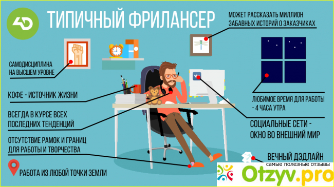 Нужно отметить, что вам не надо вставать в самую рань, готовить себе завтрак. При этом вас никто не контролирует, у вас нет жестких графиков работы, у вас нет начальства и вы не у кого не в подчинении. Это разве не здорово, вы в любой момент можете себе сделать перерыв на чай или кофе, в любой момент можете отдохнуть от работы. Поэтому я и для себя решил, что не буду работать на какого-либо шефа и всегда рассчитывают только на свои возможности. Если у вас есть определенный талант: вы профессиональный разработчик сайтов, SEO специалист, дизайнер, архитектор, конструктор, вы хорошо разбираетесь в инженерном деле, отлично знаете иностранные языки, владеете мастерством написания интересных статей, работаете в дизайнерских программ, программист, тогда вам безусловно найдется место на проекте Freelance.