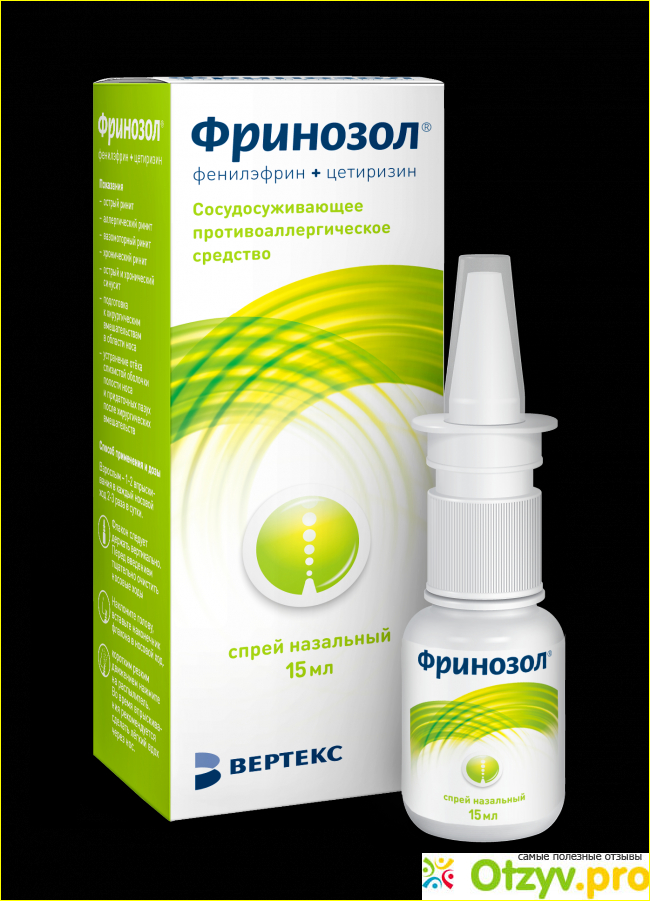 Он обладает двойным действием- сосудосуживающим и противоаллергическим и не имеет себе по составу аналогов. В нем комбинация двух лекарств - фенилэфрина и цетиризина. Еще в составе глицерол- это вещество обладает смягчающим действием на слизистую в носоглотке и не дает ей пересохнуть. От прежних капель для носа у меня начинало сохнуть в носу , с фринозолом такой проблемы не возникает. Курс лечения фринозолом не более 7 дней, но обычно он справляется с насморком быстрее. Спрей отличный, советую!