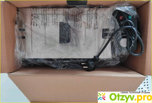 Коробка плотная, картонная. Внутри – куски пенопласта. Это обеспечивать сохранность прибора при транспортировке.