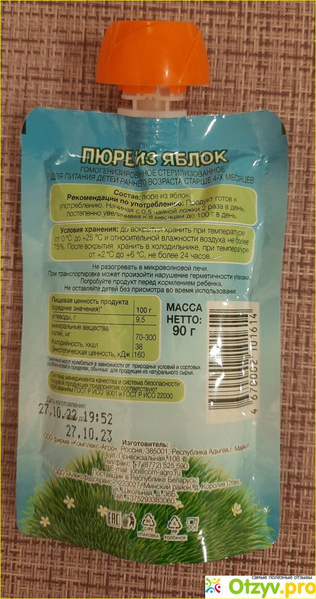 По консистенции пюре жидкое, больше похоже на сок с мякотью, но вкусное, сама ела с большим удовольствием. Сахара там не ощущается. На упаковке я тоже не нашла ни слова про его содержание (вроде внимательно смотрела). Ребёнку пюре тоже очень понравилось, моему сынишке два года и три месяца. На упаковке указано, что можно употреблять в пищу с четырёх месячного возраста. Мой в четыре месяца ещё только молоко кушал, так что не знаю как бы он это пюре оценил в таком возрасте. Он у меня вообще привереда в еде. Если решите дать попробовать это пюре ребёнку в таком раннем возрасте, обязательно вначале попробуйте сами. Даже сам производитель это рекомендует, так как в процессе транспортировки может произойти нарушение герменичности упаковки. Я в принципе все пробую снала сама, только потом даю попроботь ребёнку. У этой фирмы есть и с другими вкусами фруктовые пюре. В целом мне этот продукт и фирма понравились, вызвали большое доверие. Ни сколько не уступают по качеству более разрекламированным пюрешкам.