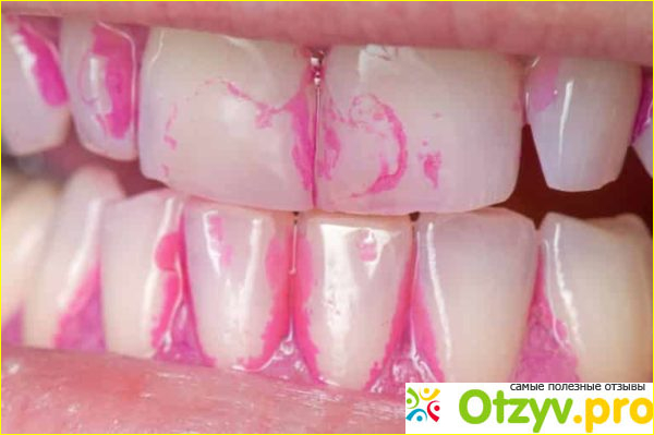 У него ярко малиновый цвет, не очень ярко выраженный запах, но, что касается цвета, он остается на какое-то время на поверхности кожи, которую обрабатывают. Но не это самое главное. Главное, это результат, который нам удалось достичь, не прибегая к помощи стоматолога.